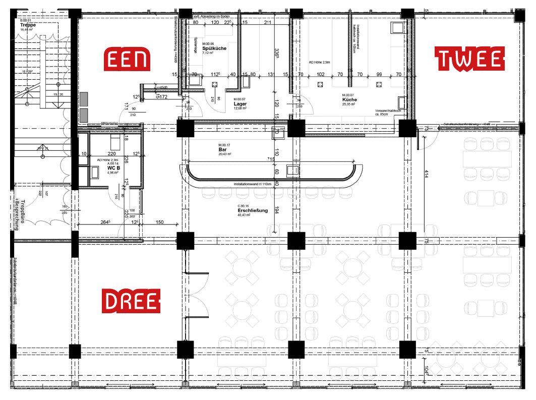 Für eure kleinen, konspirativen Meetings findet ihr im Erdgeschoss unsere Räume Een, Twee und Dree. Zwei von ihnen haben einen langen Baumkantentisch und fest installierte Screens. Der dritte ist mit seinem mobilen Screen wandelbar.